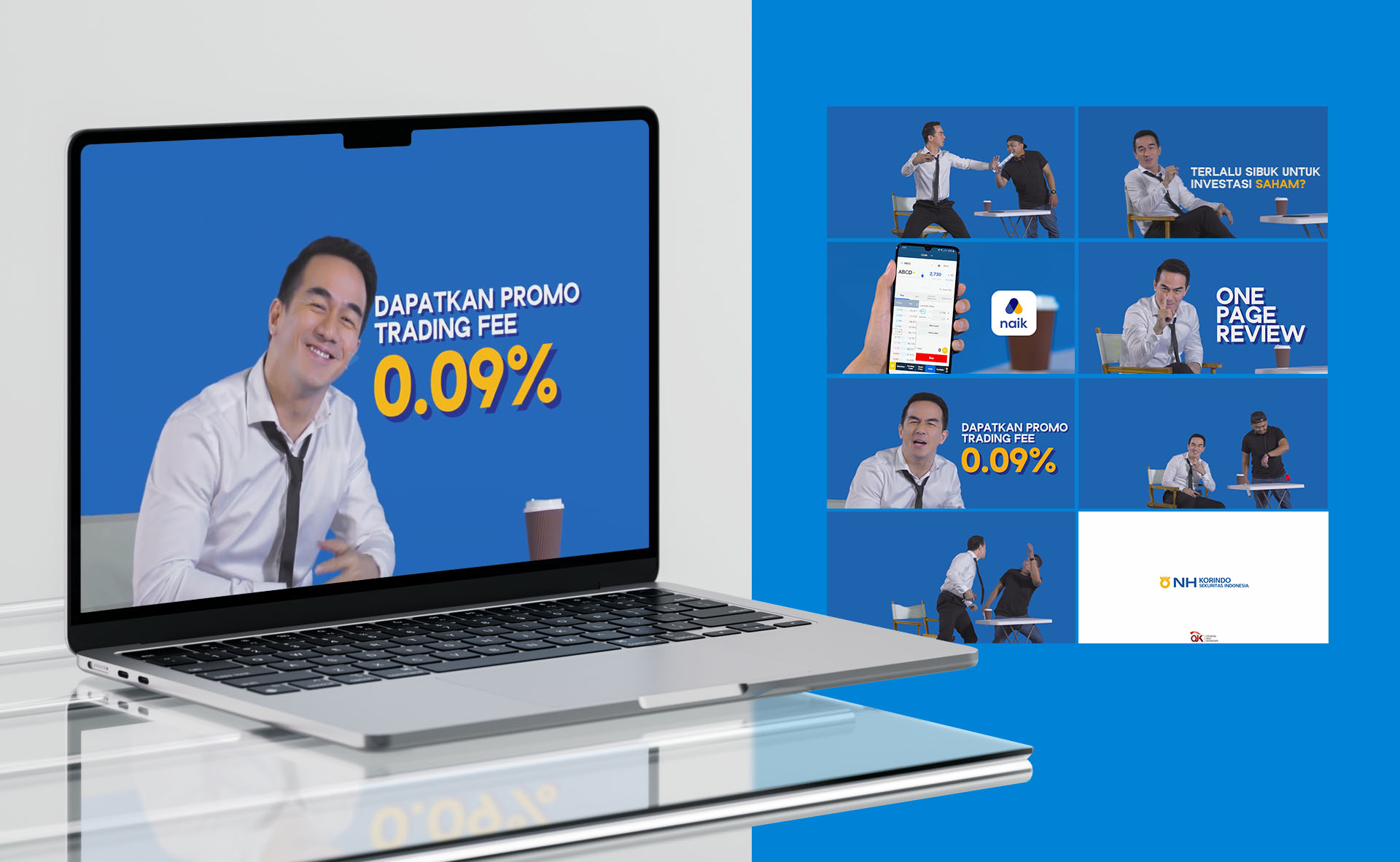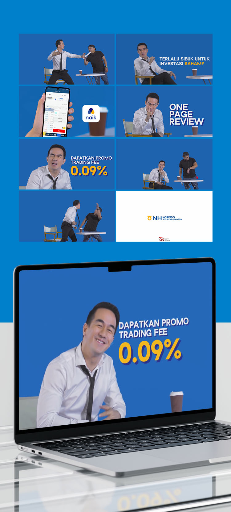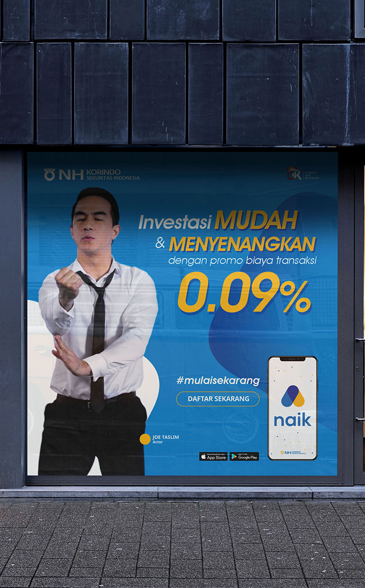 Campaign ini dibuat untuk mempromosikan naik, sebuah aplikasi investasi saham dari NH Korindo, dengan positioning sebagai platform yang menyenangkan, cepat, dan ramah bagi pemula. Menggandeng brand ambassador Joe Taslim, campaign ini membuat naik menjadi penghubung edukasi finansial dan daya tarik massa, sehingga investasi menjadi lebih mudah diakses oleh para profesional muda dan pengguna pemula.